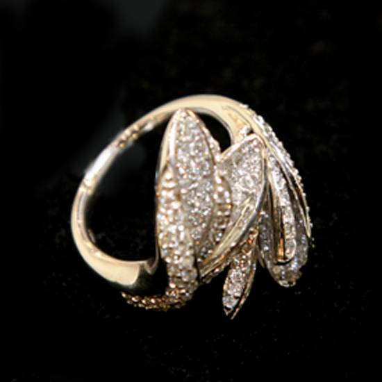 This ring shows several golden pieces covered with loose diamonds. The pieces are designed like plants, which, though not in green, demonstrate a very nice-looking picture. One side of the setting seems to be leaves pointing downwards, while at the other end is a seemingly blossoming flower. The sense of nature released from this piece is one of the main reasons why this is a perfect piece for any women.