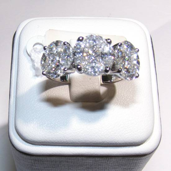 This diamond ring features at least three round-shaped diamonds. The round shape and the faceted nature both help the diamonds sparkle extremely nicely, because the surfaces of the diamonds can reflect the most lights it can. The diamonds are of the same size, orderly placed next to each other, creating a sense of balance.