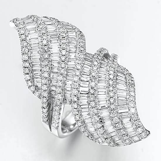 This ring reflects a lustrous sheen with a distinctive shape with sparkling diamonds. The highly-polished silvery surface extends its brilliance in a flattering way. The elegant design brings a romantic flair to your next special occasion.