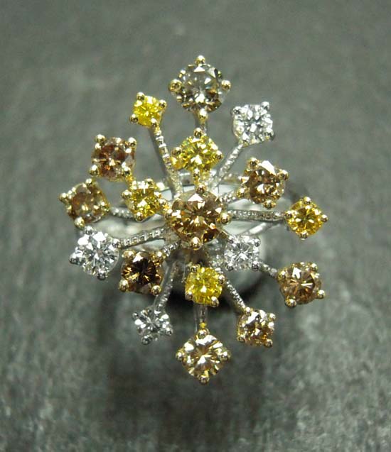 This diamond ring flaunts a special snowflake-shaped design. This enchanting ring is crafted of 18-karat white gold and adorned with stunning yellow and white diamonds, which is highly taking over the fashion world with its storming appearance.