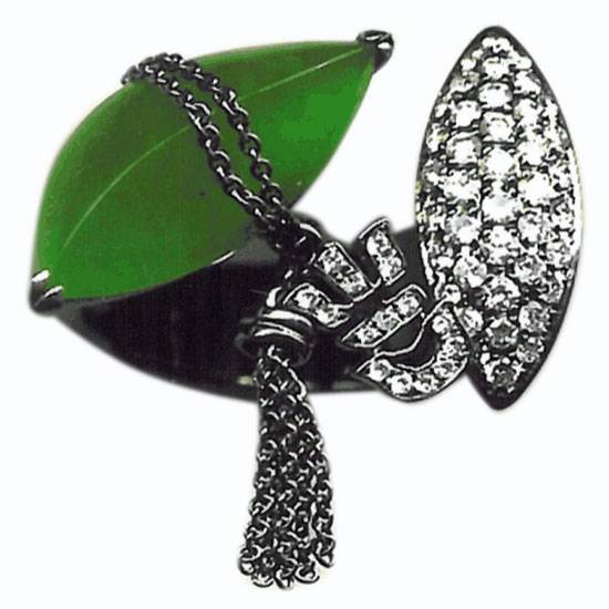 This beautiful ring features silver construction with diamonds on the front. It boasts a piece of leaf-like green jade for a hint of elegance. This sophisticated ring is perfect for special occasions.