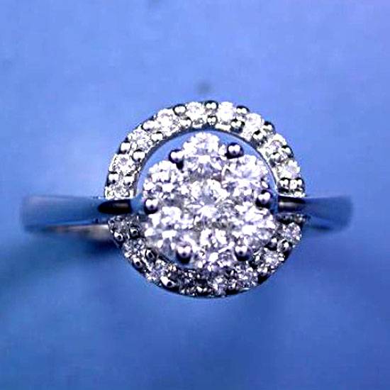 This diamond ring boasts an elegant appearance with a floral shape embraced by a ring, all paved with loose diamonds. The quality diamonds are finely cut and paved for irresistible glamor. The lovely design of this diamond ring makes it a perfect choice for young ladies.