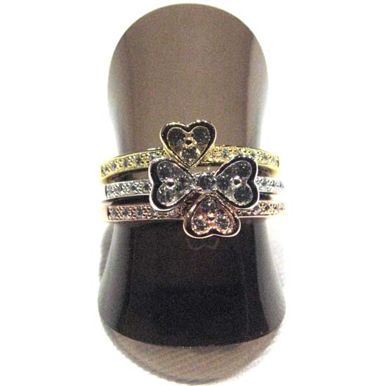 The stylish ring comes with a special 3-in-1 design, composing three bands in golden, silvery and red colors. The highest and lowest band carries a flower petal charm while the middle one is getting two, a clover arises when they come together. They bed is embedded with dazzling diamond which shines in utmost brilliance.