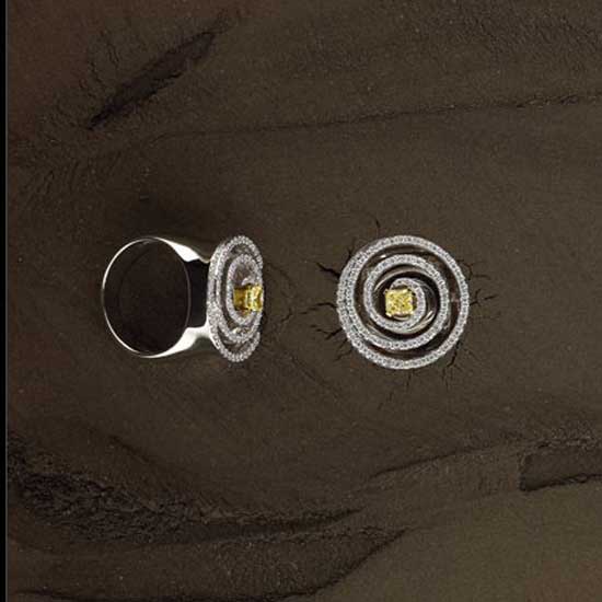 This eye-catching white gold ring features a tourbillon charm, with a radiant cut fancy yellow diamond encircled by 95 white brilliants. The charm is sparkling with maximum brilliance in a spiral pattern which draws you into deep obsession.
