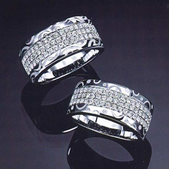 The ravishing ring features a band carved with semi-hoop patterns and triple rows of round diamonds. It captures the whimsical elegance with its stunning design. It shines with radiance of sophistication.