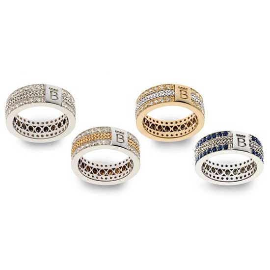 The stunning white gold ring appears in a thick band embedded with diamonds, onyx stones, sapphires and rub stones. It features a silvery charm carved with a logo. With the enfolding pleasure of indissoluble bonds, the ring symbolizes infinity.