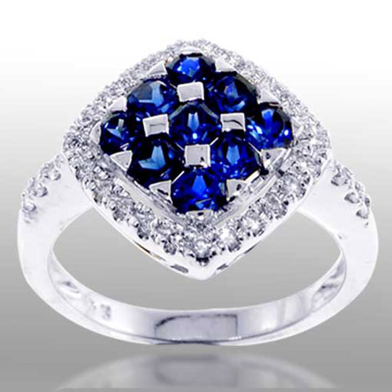 The ring features a rhombus-shaped pendant set with diamonds and sapphires. It is delicately made to give a polished finish. This ring will make a great addition to your jewelry collection.