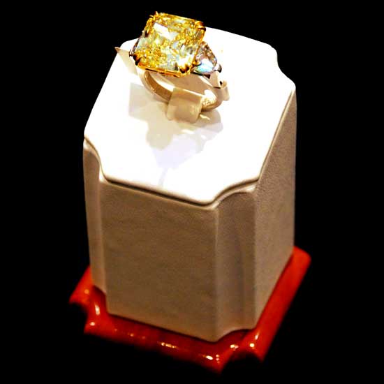 This ring is centered with a gorgeous yellow diamond that looks absolutely breathtaking. The diamond comes in a natural intense yellow color in a pillow cut. The enticing dazzle can easily capture ladies’ hearts.