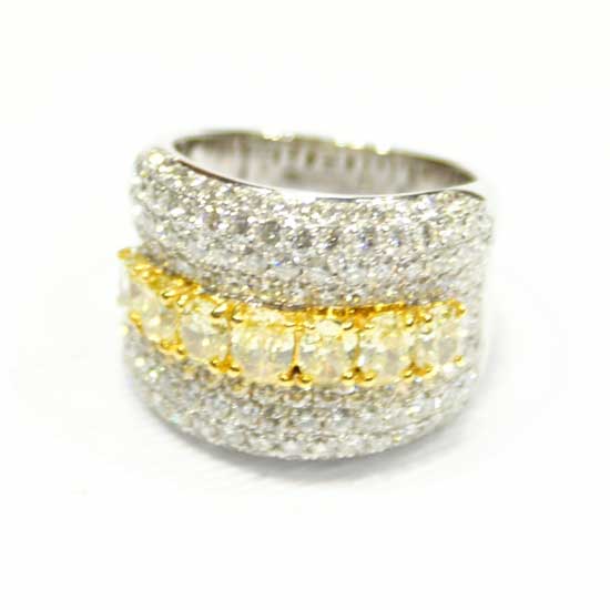 The finger ring coming with a broad band showcases a superior touch. It is dressed with eye-catching 1.66ct fancy yellow diamonds. This ring is further enriched with 2.55ct diamonds for a more elaborate look.