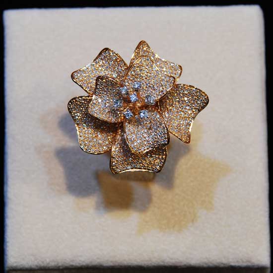 The pictured ring is carefully built with quality rose gold and gleaming loose diamonds. The ring proudly presents a gorgeous blossoming flower at the center. Give yourself a graceful makeover with this delightful piece.