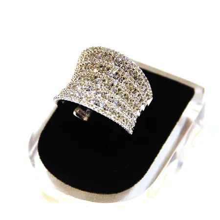 The 18K white gold ring is fully paved with dazzling diamonds. The bold and elegant design lets it stand out among the rest. Dress your finger in lavish elegance with this luxurious diamond ring.