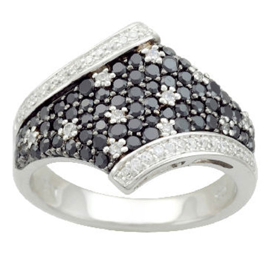 Inspired by stars in the dark sky, this diamond ring features white stones scattered within black stones. Curvy bands decorated with diamonds half enclose the central adornment. This beautiful ring is a work of fine craftsmanship and innovation.