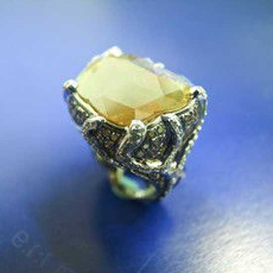 The stunning diamond ring goes great with elegant outfits. The natural fancy diamond slice sets on a bi-colored diamond mount for added glamor. It is hand carved and made by the designer, Jessica Lin. It is designed to present the beauty of nature.