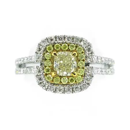 This sparkling ring comes with natural white diamonds encompassing yellow ones for an attention-grabbing effect. The two slim bands are also paved with white diamonds. This exceptional diamond ring is a delightful gift for your loved one.
