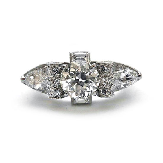 - Centering an old European cut diamond with a pair of old cut pear-shaped diamonds on each side.