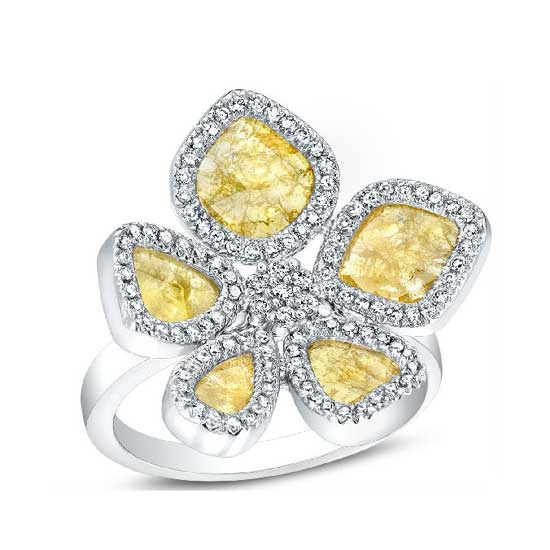 Add a touch of spring or summer to your day regardless of what it is like outside! Natural yellow sliced diamonds, prong-set in a dazzling frame of round diamonds around a diamond-encrusted center, make the petals of this blooming ring. A guaranteed compliment catcher!
