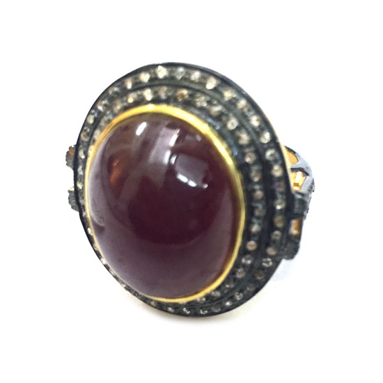 This is a fashionable finger ring that comes with a large round stone as the centerpiece. The allover dazzling diamonds add a sparkling effect to the whole piece. This finger ring shimmers with a high-gloss finish.