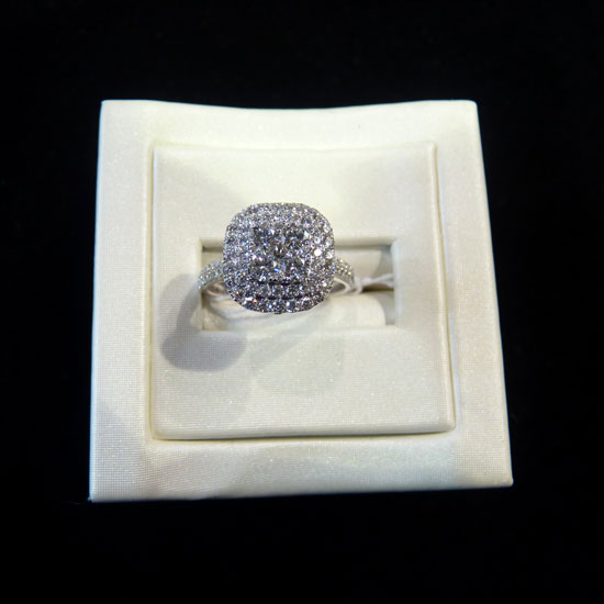 This is a fashionable finger ring that is accented with allover shimmering diamonds. The 18K white gold construction shimmers with a high-gloss finish. This finger ring is an ideal addition to complete your fashion collection.
