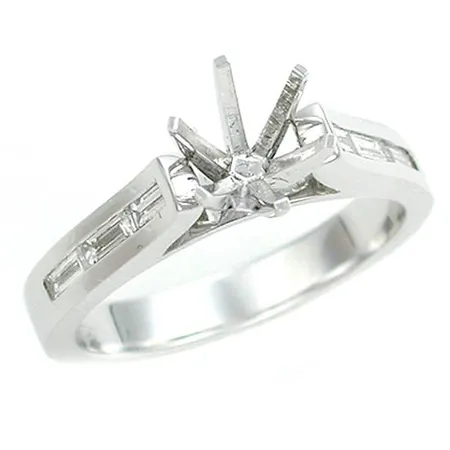 This is a 18k white gold diamond ring setting. It features a setting with six prongs for a diamond or other gemstomes in the centre. The shank of the ring is decorated with six channel-set baguette diamonds.