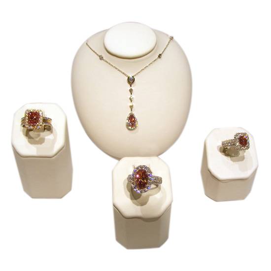 These are a diamond necklace and three diamond rings set in silver. Each of the items features a pink diamond in cushion, pear and oval shapes respectively. Each of the pink diamonds is surrounded by multiple small round white diamonds.