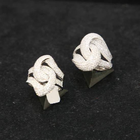 This ring displays an irregular pattern covered with diamonds. The faceted diamonds make the piece sparkle nicely. The ring shows two ribbon-like patterns interlocking with each other closely, which symbolizes mutual support and love between lovers. Given this meaningful pattern, the ring serves best as an engagement ring.