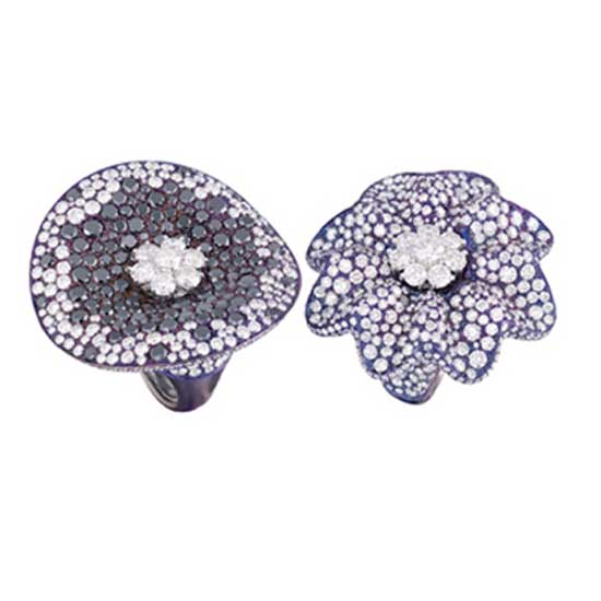 The two 18K white gold titanium rings come in plate- and flower-shaped construction. They are accented with white and black diamonds to give a shimmering appearance. Draw attention to your fingers with these gorgeous rings.