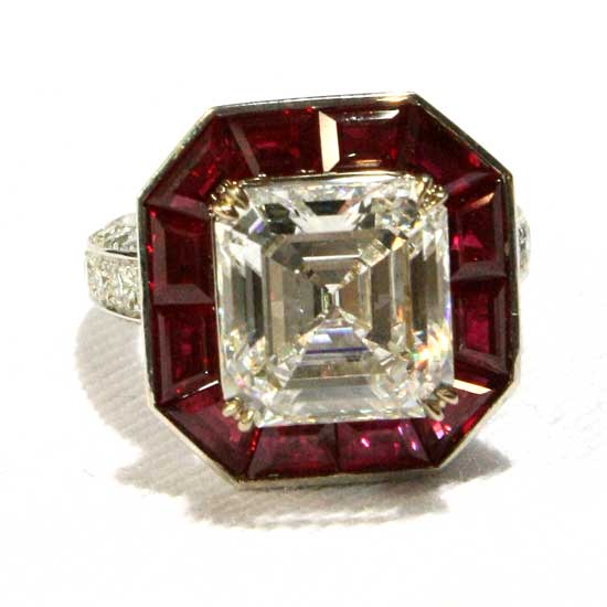 The ladies' ring radiates an enchanting glow of elegance with the sophisticated square-shaped centerpiece. The square emerald-cut diamond sparkles proudly and takes your breath away once you lay an eye on it. Embraced by high-luster ruby stones, this gorgeous diamond ring is truly the deserving one to be admired.