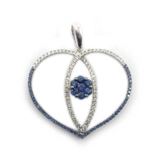 This beautiful 18KBW gold pendant features a heart-shaped design with interlocking details. It is highlighted with sparkling diamonds and sapphires for added appeal. This delicate pendant looks great with your daily outfits.