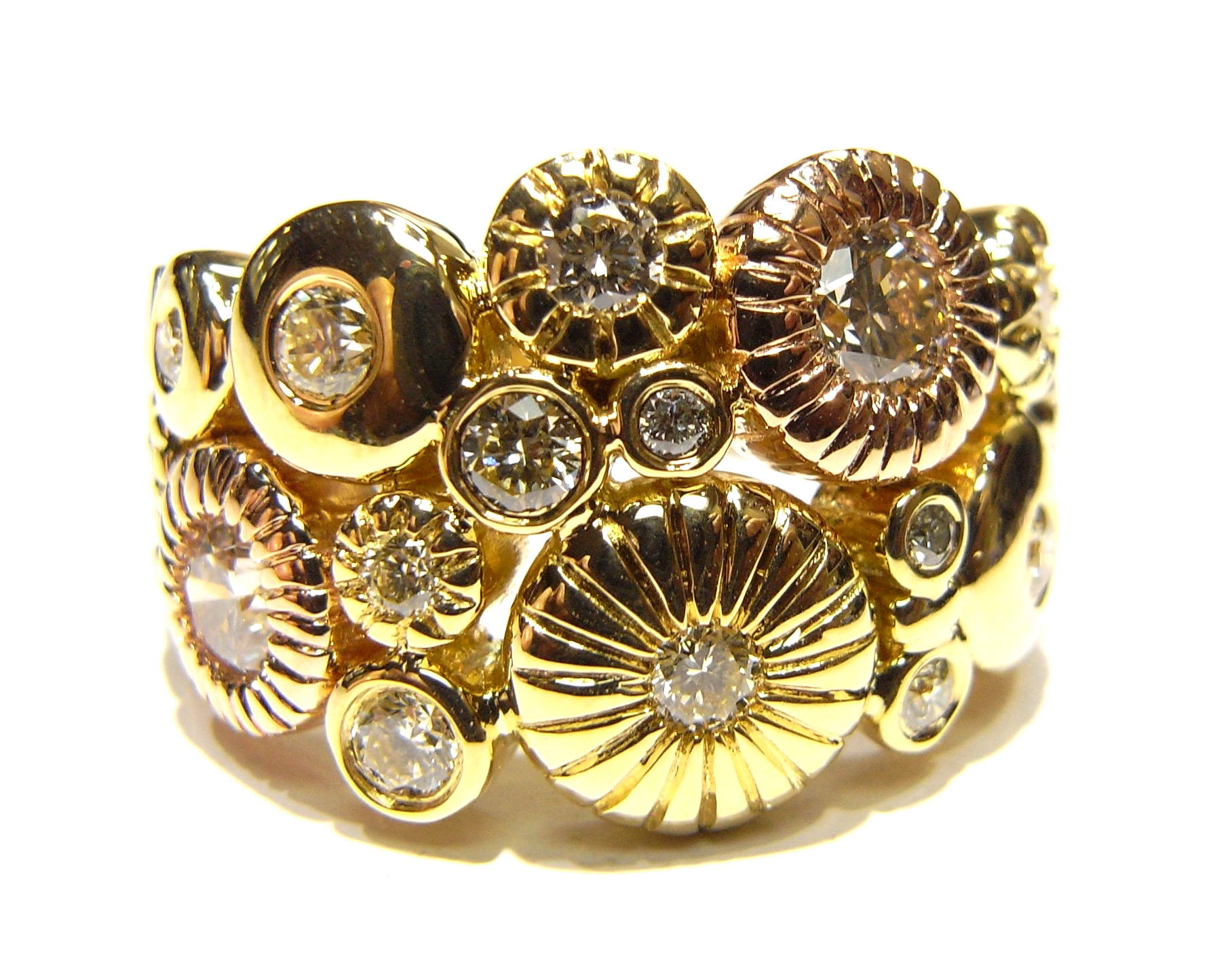 This ring features cascading gold swirl discs as its design core