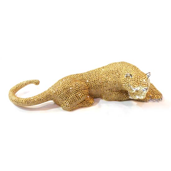 Capturing your attention is a stunning tiger decoration in yellow gold. It is fully paved with shimmering diamonds for added class and sparkles. This dazzling home decoration will impress any guest at first glance.