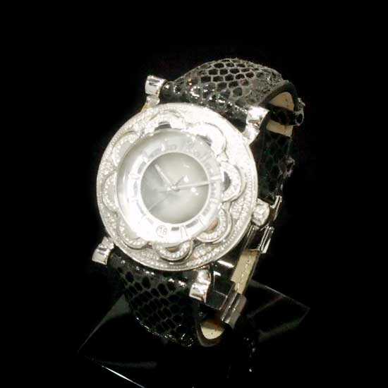 This cool analog watch comes with a floral like round bezel with sparkling diamonds. It also features a 316L steel case and a genuine leather strap with cutout details. This noble wristwatch boasts 5ATM water resistance.