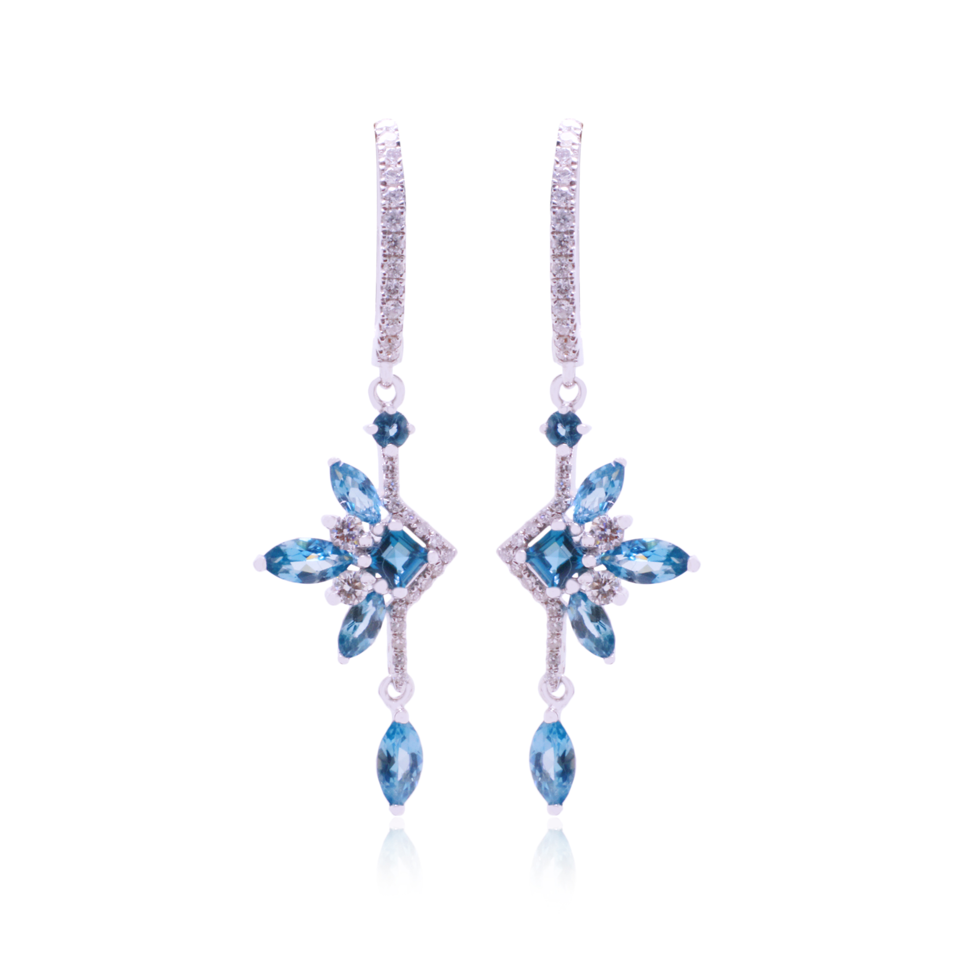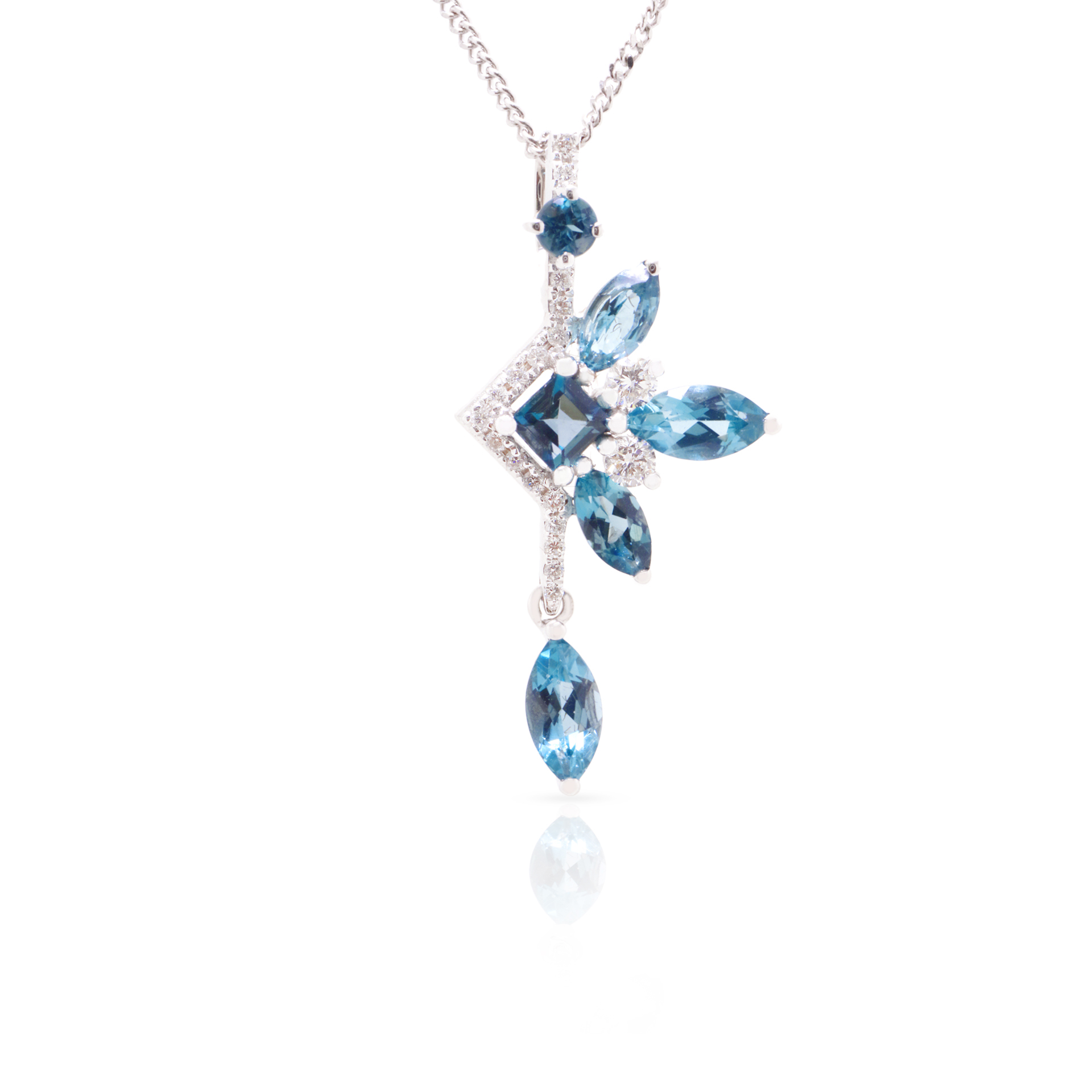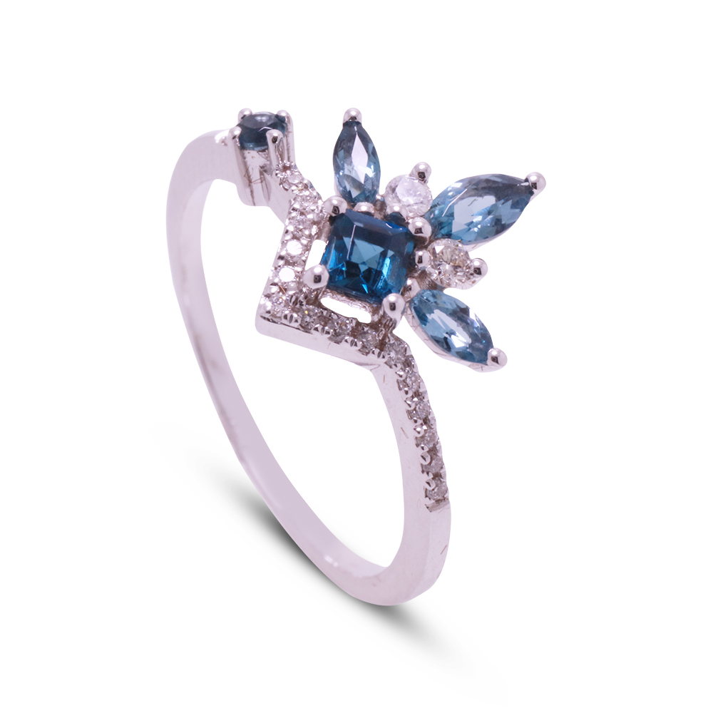 Ring, Earring, and Pendant18K White Gold: 7.18GramsRound Diamonds: 97pcs / 0.504CaratLondon Blue Topaz Garnet: 23pcs / 3.101Carat