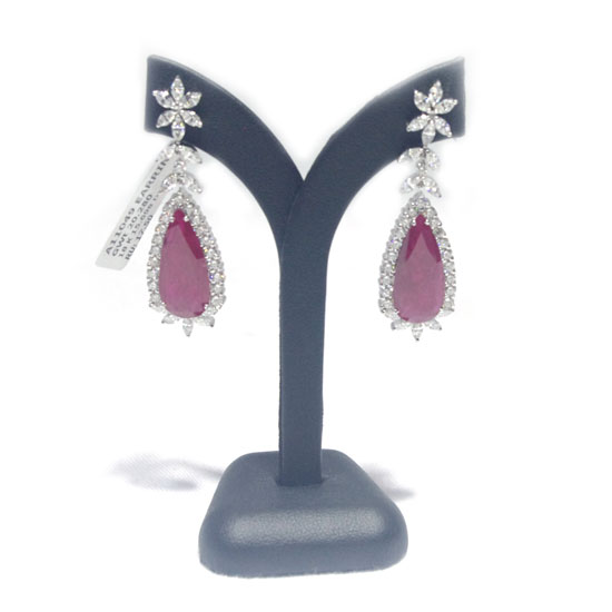 This is a pair of earrings with a beautiful and elegant appearance. Each piece comes with a pear-shaped ruby stone which is encircled with white diamond elements. The flower-shaped accents make this pair of earrings look more unique.