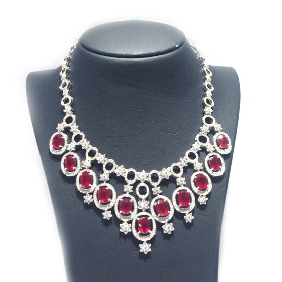 This necklace appeals to people with its noble and deluxe design. It finely inlaid 11 oval ruby stones and masterly paved with shimmering diamond elements. This necklace surely is a great addition to your fine jewelry collection.