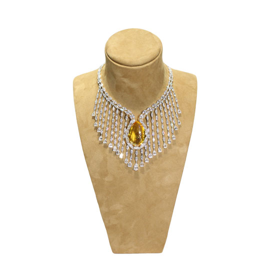 This necklace appeals to people with its sparkling and deluxe appearance. It features an 18K white gold mounting and a golden sapphire stone centerpiece. This necklace comes with assorted diamond accents for added charm.