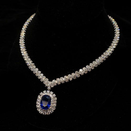- Platinum necklace with diamonds and a sapphire.
