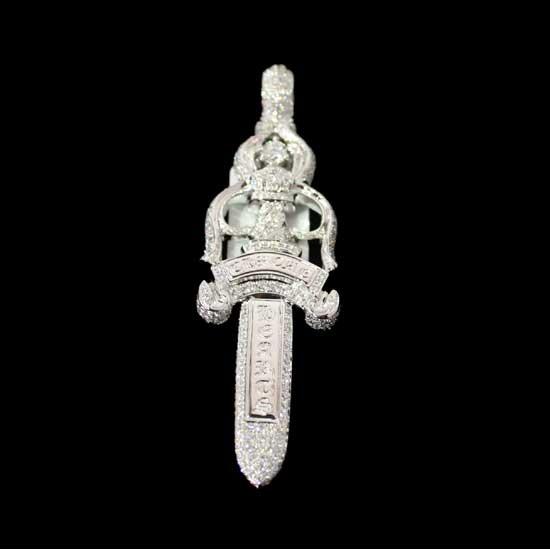 This pendant has the shape of a sword. The piece is finely constructed from diamonds and 18K white gold. The well-designed pendant goes well with your daily wear.