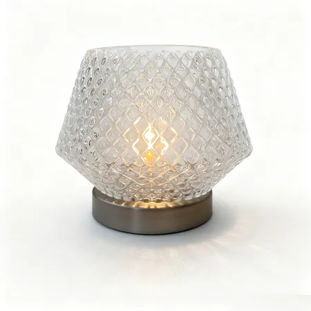 This diamond-patterned glass decorative lamp features a transparent glass lampshade with exquisite diamond patterns and a metal-textured base. When powered on, the light refracts a unique light and shadow effect through the diamond-patterned glass. It can be used not only for lighting but also as a home decoration ornament, adding an elegant and delicate atmosphere to the space. It is suitable for placement in various scenes such as living rooms and bedrooms.