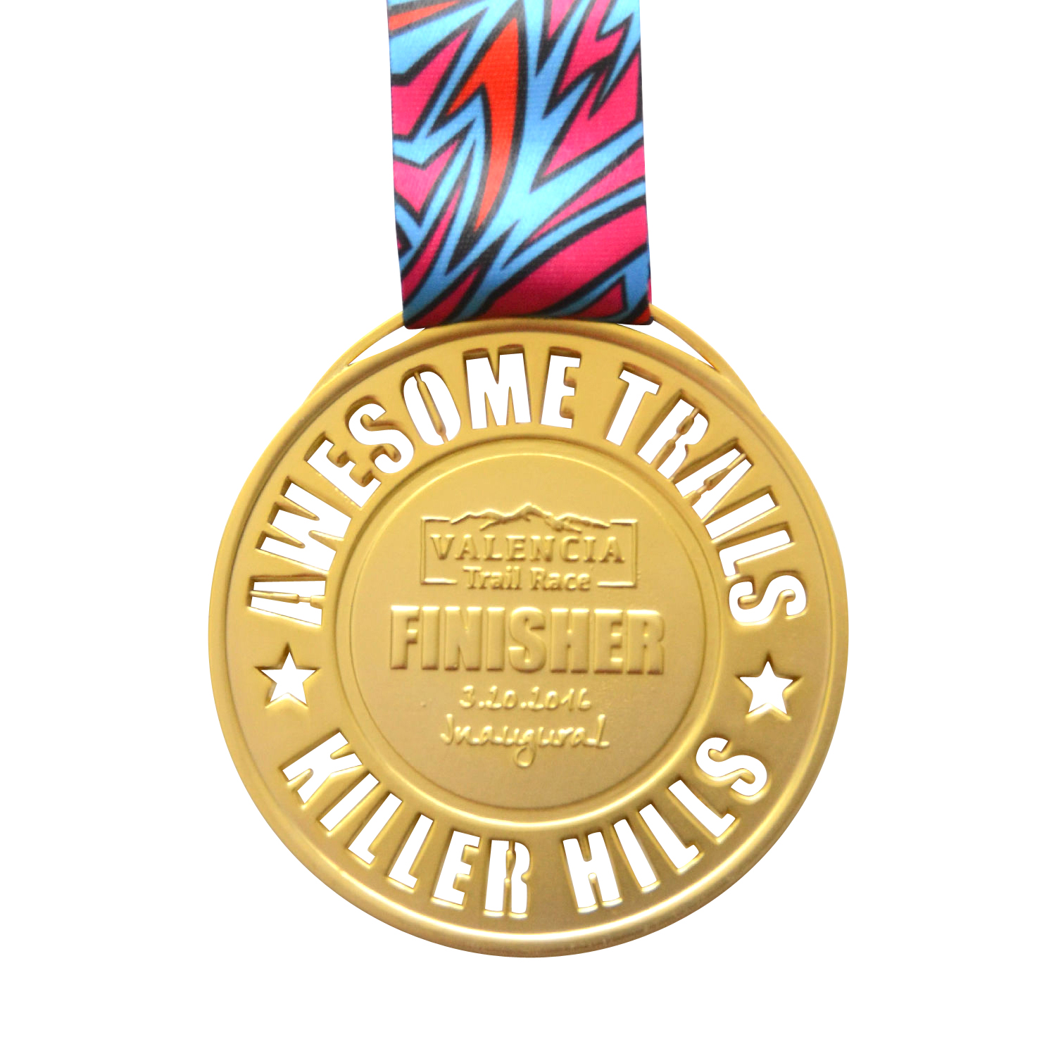 Give a memorable keepsake to the winner of the tournament with this metal medallion. Lavished with a layer of matte gold plating, the zinc alloy medal is wreathed with cut-out words along the rim to denote the name of the trail, while a colorful neck ribbon is equipped alongside the medal to offer effortless attachment.