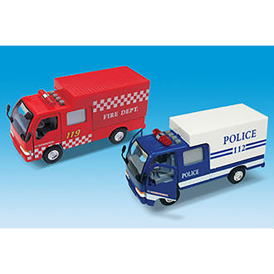 Keep your kids busy with this set of pull back die cast toy trucks. The set includes 4 assorted trucks in police or fire department theme and comes with siren sounds and flashing light bars. They are safe and fun to play with and can help develop the imagination of children.