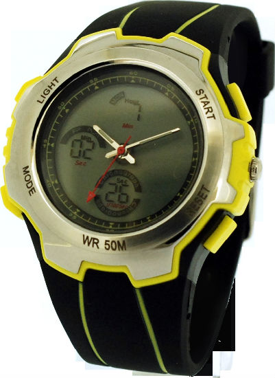 Perfect your fashionable outfit with this dandyish digital-analog watch. Coming with a black band with vibrant yellow lines and details, the watch airs a swanky touch to catch all attention. Its combination of digital and analog display stands out from other ordinary watches and provides you with accurate time display. The watch makes a practical and stylish accessory to the fashionable people.