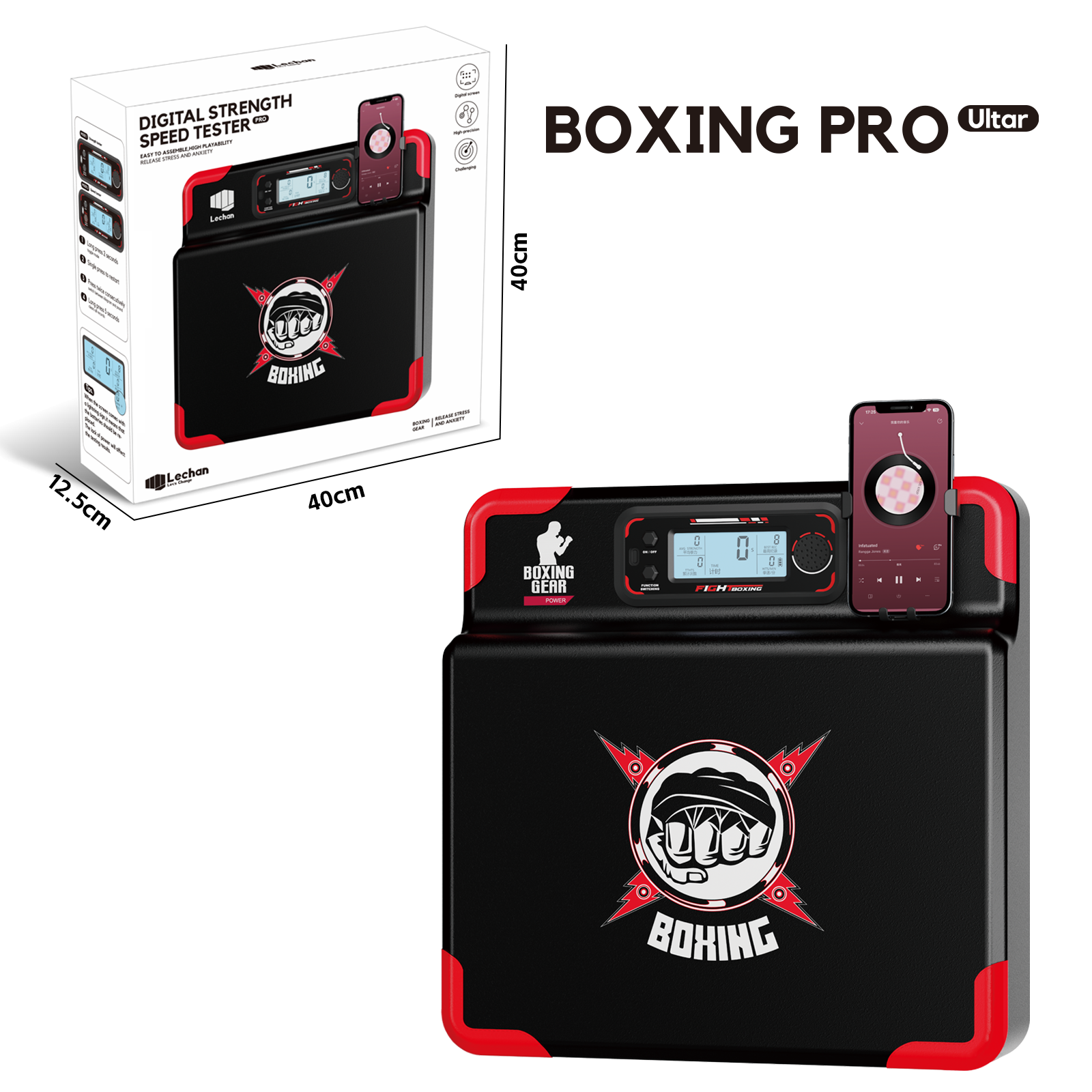 The boxing strength tester is a robust training device designed for athletes and fitness enthusiasts. Constructed with durability in mind, this sturdy machine is built to withstand intense workouts. It features a digital screen that displays essential data, including timing, average punch strength, cumulative punch count, best record, and punch speed per minute. Additionally, the device includes a convenient clip on the top for securely holding a mobile phone, allowing easy access to apps or media during training sessions. This testing machine is an ideal addition to enhance boxing performance by providing precise and real-time insights.