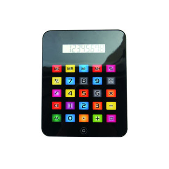 This chic and attractive calculator comes in an iPad size. It has a black panel with colored buttons and a digital display. This high quality calculator is a helpful tool for home and office use.