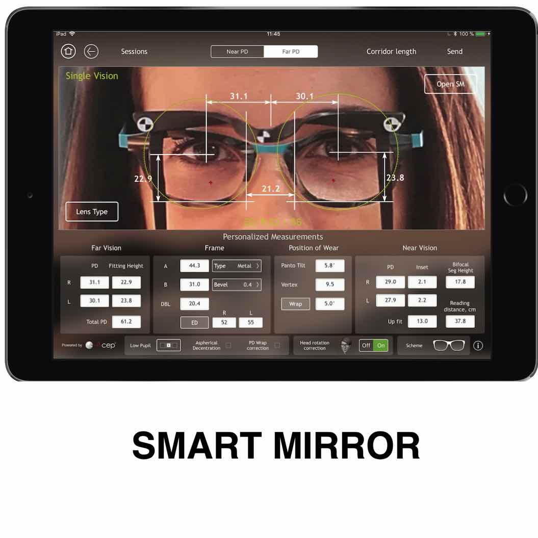 Take all the necessary fitting parameters such as Distance and Near Monocular PD, Fitting height, Pantoscopic tilt, Vertex distance, Frame wrap, Reading distance, Inset, and recommend the best corridor length selection. Taking all these measurements with the smart mirror is a real no-brainer and gives you a high tech image that your customer expect from you.