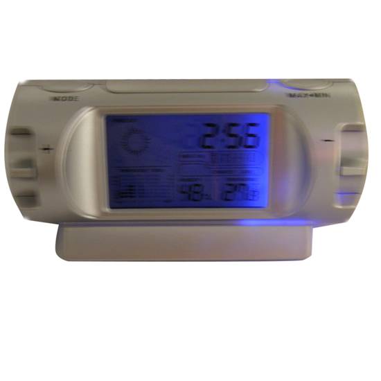 This is a digital desk clock with a shape like a mini-scale game console. Like the game consoles, there are buttons at the top edges and the 2 sides.