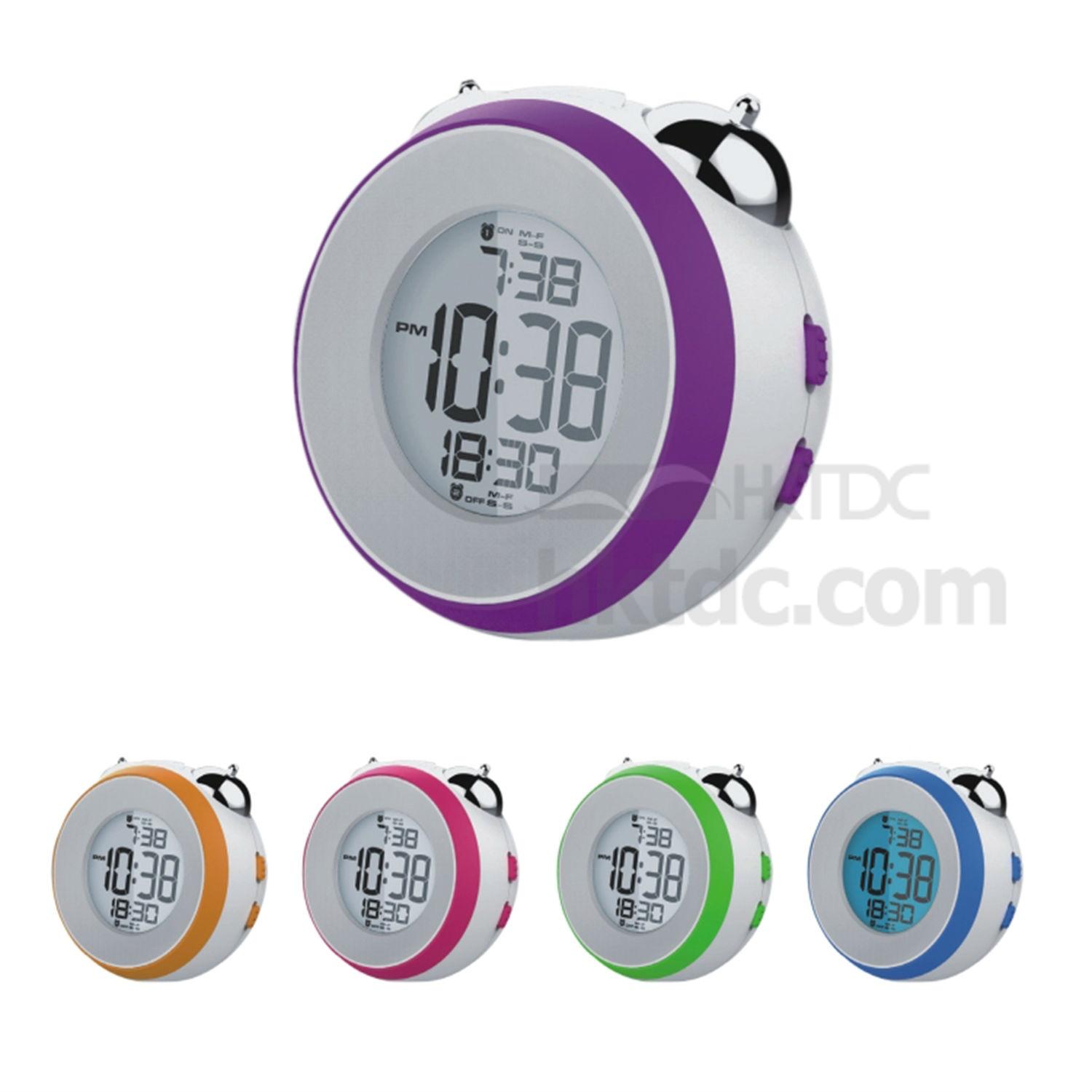 This digital clock has an LCD display with blue backlight and offers 12/24H time display. It comes in a compact round shape and has two alarm bells on top. The LCD alarm clock supports workday and weekend alarm setting function and ensures accurate time keeping.