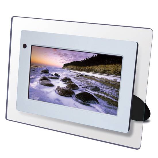 This digital photo frame includes a 7" LCD display. High quality resolution of 480*234 is provided. It is adorned with a transparent edge.