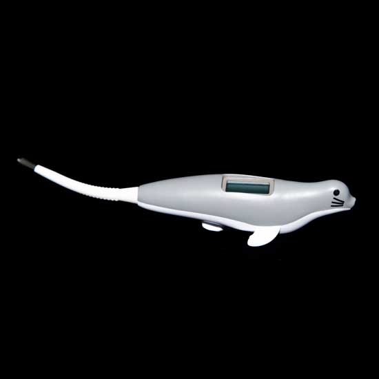 This eco digital thermometer features a gray and white dolphin appearance for uniqueness. It comes with a digital screen for easy showing the results. This reliable digital thermometer is manually operated.