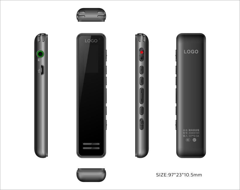 Material: zinc alloy metal Internal memory: 4GB/8GB/16GB Two stereo microphones inside One-key record, stop and playback LCD: OLED display multi-languages Speaker spec:8Ω,1W High quality recording up to 1536kbps Music format: MP3, WMA,WAV FM tuner and FM record Record format: WAV and MP3 reference recording time for 8GB: PCM(1536kbps)---12hours Noise Cancellation(384kps)---48hours HQ(128kbps)----136hours LQ(8kbps)----2228hours Power supply: 320mah rechargeable Lithium battery Recording time for full recharged: PCM--12hours, Noise cancellation--17hours HQ--28hours Dimension: 97*23*10.5 mm Weight: about 28g Accessories: Earphone, USB cable