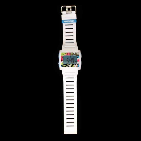 This digital watch comes with a hollow band in white. It features Square case with colorful printed patterns on the bezel for added uniqueness. The quality display shows precise and accurate time information.
